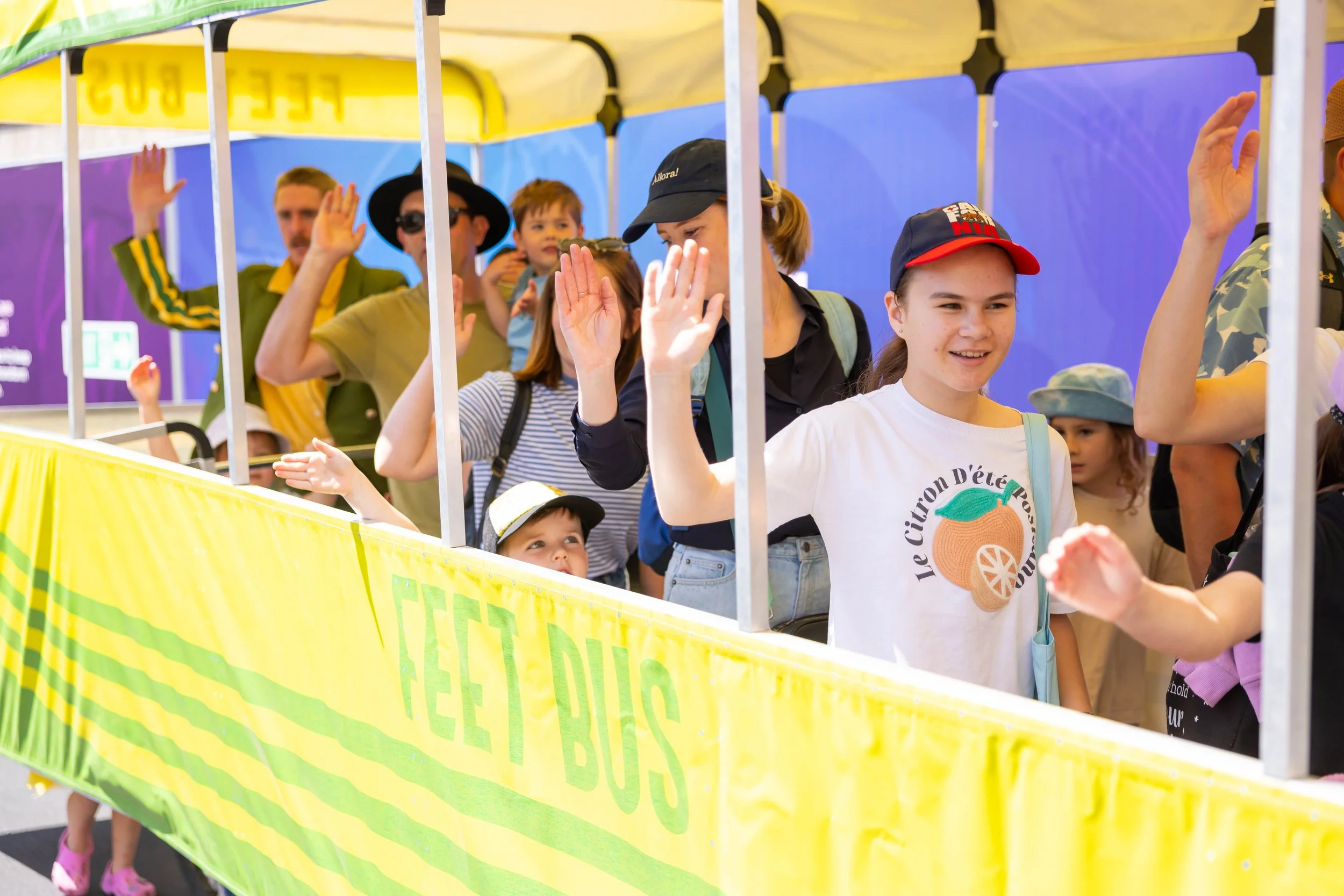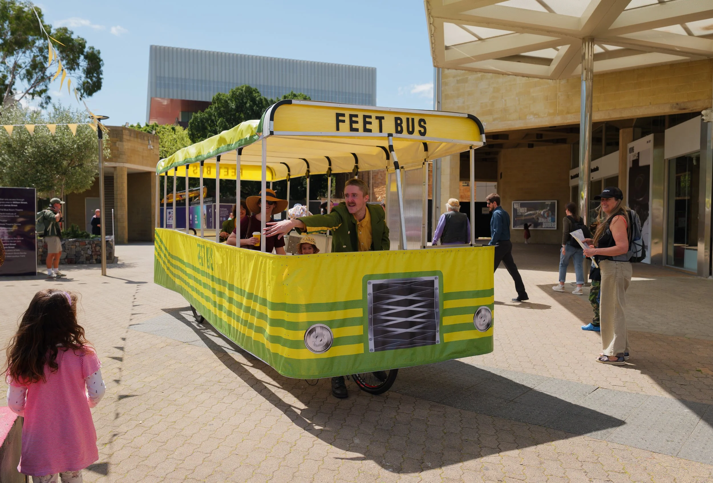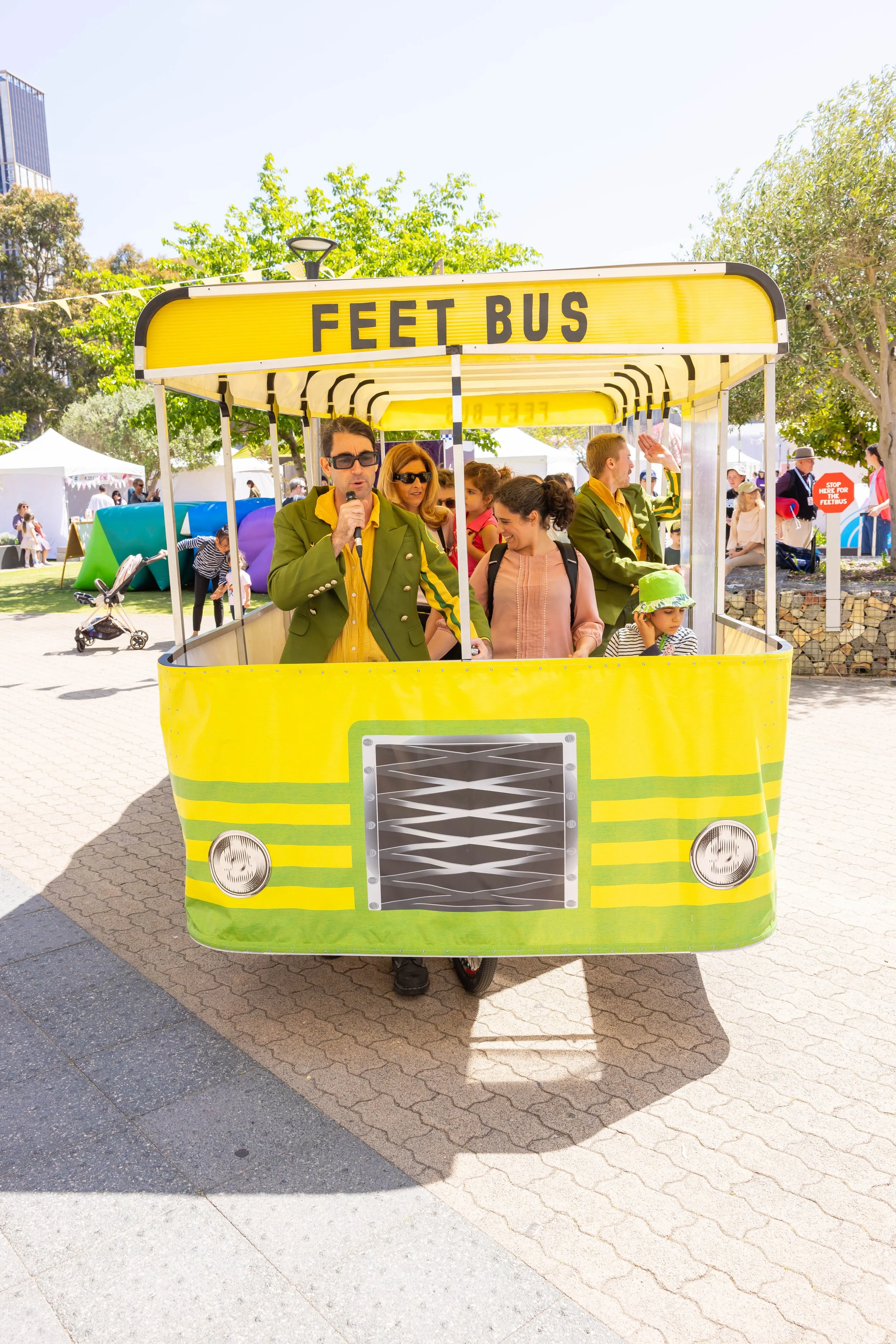 The Feetbus is a box with bicycle wheels that looks like a bus. As soon as people see it they get into the game and often rush to catch a ride.