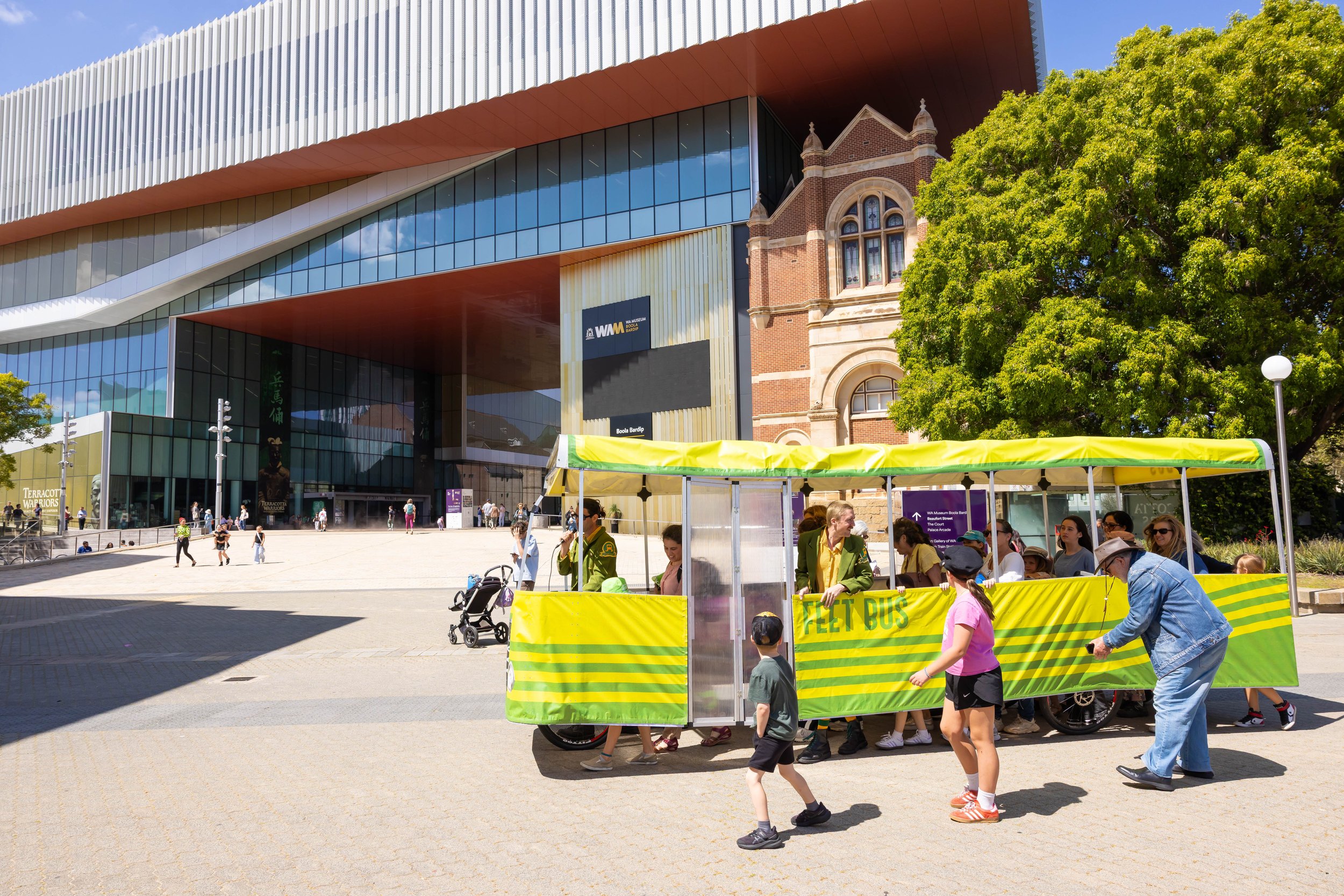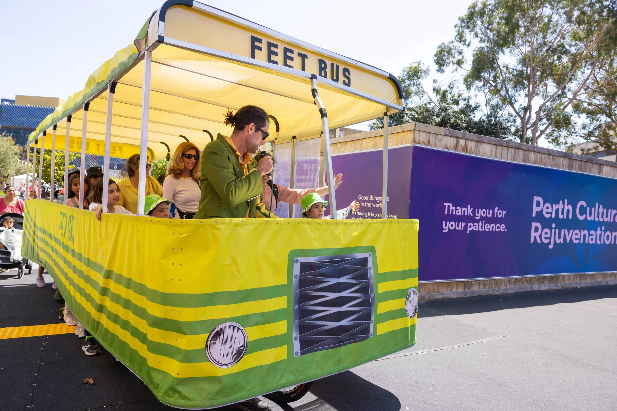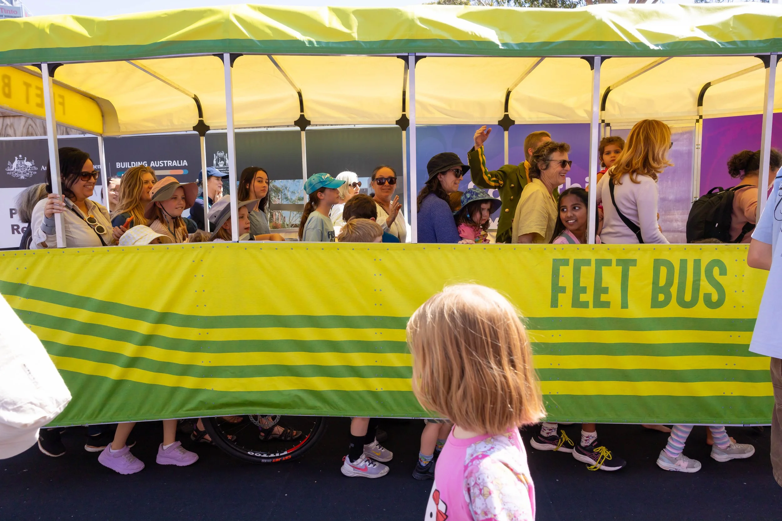 The Feetbus is a box with bicycle wheels that looks like a bus. As soon as people see it they get into the game and often rush to catch a ride.