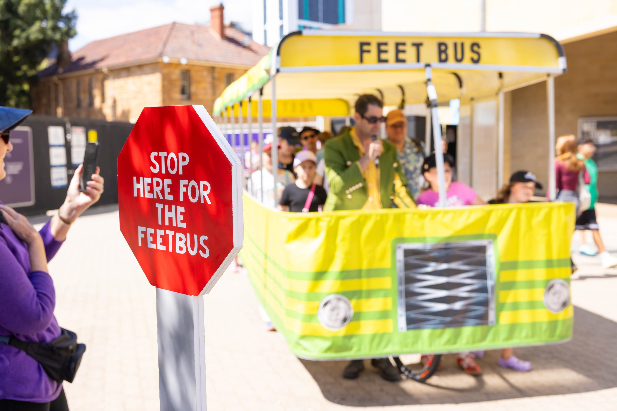 The Feetbus can be used to make a point about the benefits of walking and connecting with fellow humans. All of this is done with an absurd irreverent tone, through laughter we let our message and our meaning play its way to our audience.