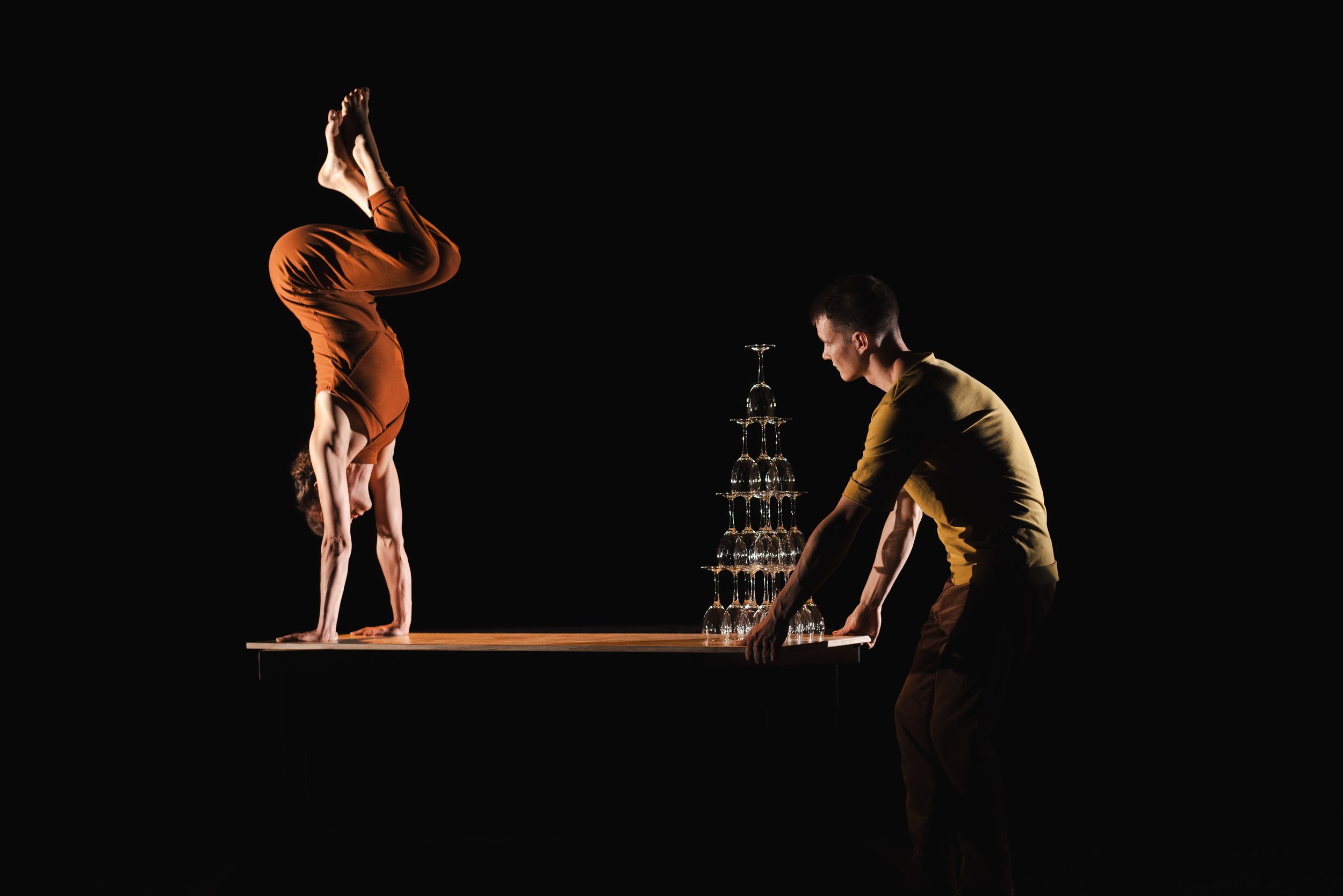 “Soft Spot” is a 55 minute duo show with a juggler, a hand stander, a few hundred wine glasses and wooden planks. This indoor show is a meticulously composed ode to vulnerability suited for a mixed audience from 7 years old. The 30 minute version is made for younger audiences as well as school classes. It is very adaptable and can therefore be performed both outside and inside.